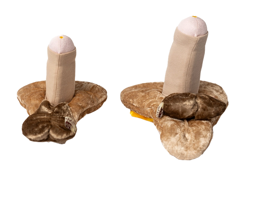Hodensack mit tast,- und herausnehmbaren inneren Hoden, Dammnaht, sichtbare und nach innen gehende Harnröhrenöffnung, sichtbarer Anus, erigiert, bewegliche Vorhaut. Der Penisschwellkörper lässt sich ebenfalls komplett herausnehmen.